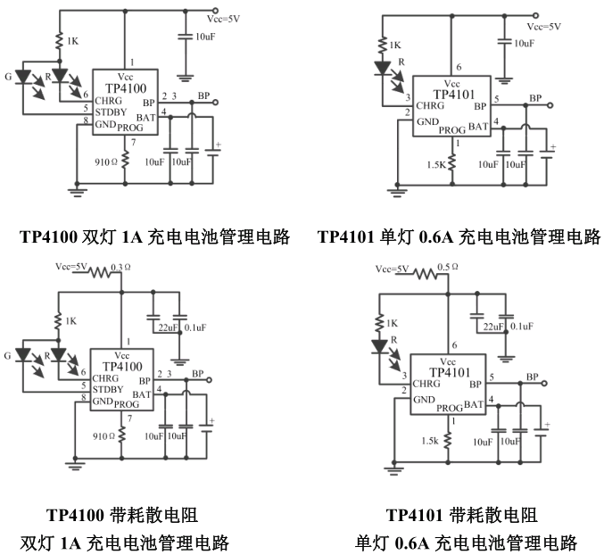 1、为保证各种情况下可靠使用,防止尖峰和毛刺电压引起的芯片损坏,建议 TP4100/TP4101 应用中 Vcc 端和 BAT 端分别 10uF 的陶瓷电容以及 0.1uF 陶瓷电容,所有电 容位置须靠近芯片引脚放置,不宜过远。在应用于电源反接保护环境下,要求使用带耗散电 阻并增大输入电容的应用电路。