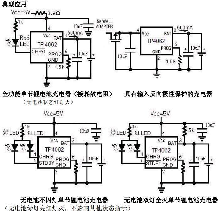由于采用了内部 PMOSFET 架构,加上防倒充电路,所以不需要外部检测电阻器和隔离二极管。热反馈可对充电电流进行自动调节,以便在大功率操作或高环境温度条件下对芯片温度加以限制。充满电压固定于 4.2V,而充电电流可通过一个电阻器进行外部设置。当充电进入恒压阶段时,充电电流会自动减小。当充电电流降至设定值的 1/10时,指示灯转灯,但充电电流不停机,充电电流逐渐减小并将电池电压保持在 4.2V。当输入电压(交流适配器或 USB 电源)被去除时,TP4062 自动进入一个低电流状态,电池漏电流在 2uA 以下。TP4062 的其他特点包括充电电流监控器、欠压闭锁、两个用于指示充电结束和输入电压接入的状态引脚。