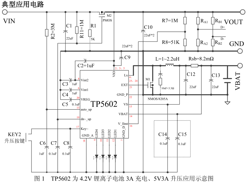 TP5602 是一款全集成功能的移动电源专用超大规模集成电路,专为中大功 率移动电源设计。内部将自动充电管理和电池隔离 PMOS2、升压管理、电量显 示、电池保护等多种功能集成到单一芯片中,外加一个输入隔离 PMOS1,一个 功率 NMOS1,一个电感,少量阻容元件,应用电路简单,性能稳定可靠,免调试大生产,高效高良率。
