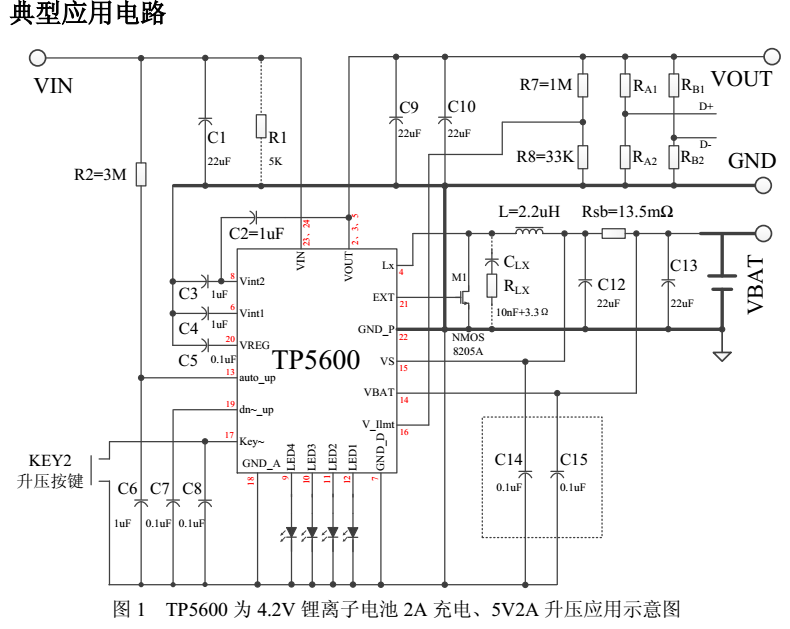 TP5600采用独特的单一电感复用技术,内置高效同步降压4.2V 2A锂电池充 电电路和同步升压型5V 2A输出电路;4路LED显示输出,可以5段显示充电和放 电时的电量,可适用于红、绿、蓝光LED直接驱动,也同时用于异常状态报警显示;无需外部电池保护电路,内部集成电池多种输入和输出保护(过压、过充、欠压、过流、短路等)。