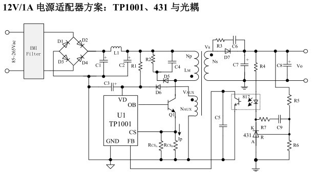 TP1001 搭配 TP1550(或 431)、光耦可以精确的控制恒压/恒流(CV/CC),即可实现